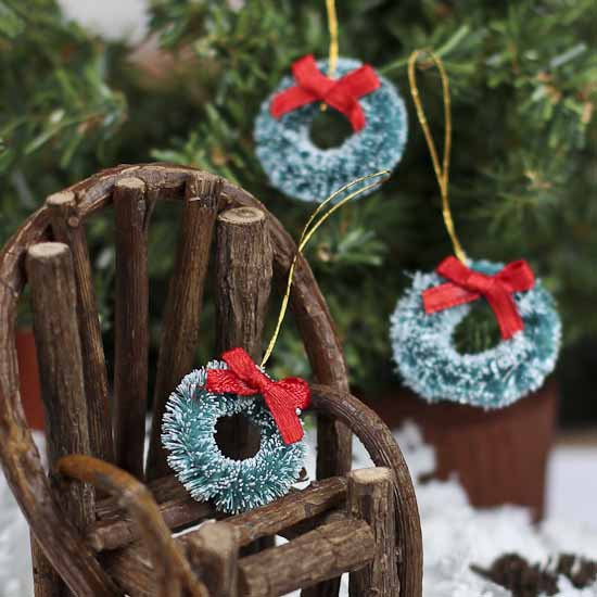 Small wire-based rings are decorated with bristly, sisal-made pine needles. These rich pine green sisal fibers are dusted with a bright winter white paint, bringing a perfectly playful combination of color and visual texture. All are topped with shiny red satin ribbon bows. Thin gold string extend from their tops, for attaching, connecting, and displaying as you please!