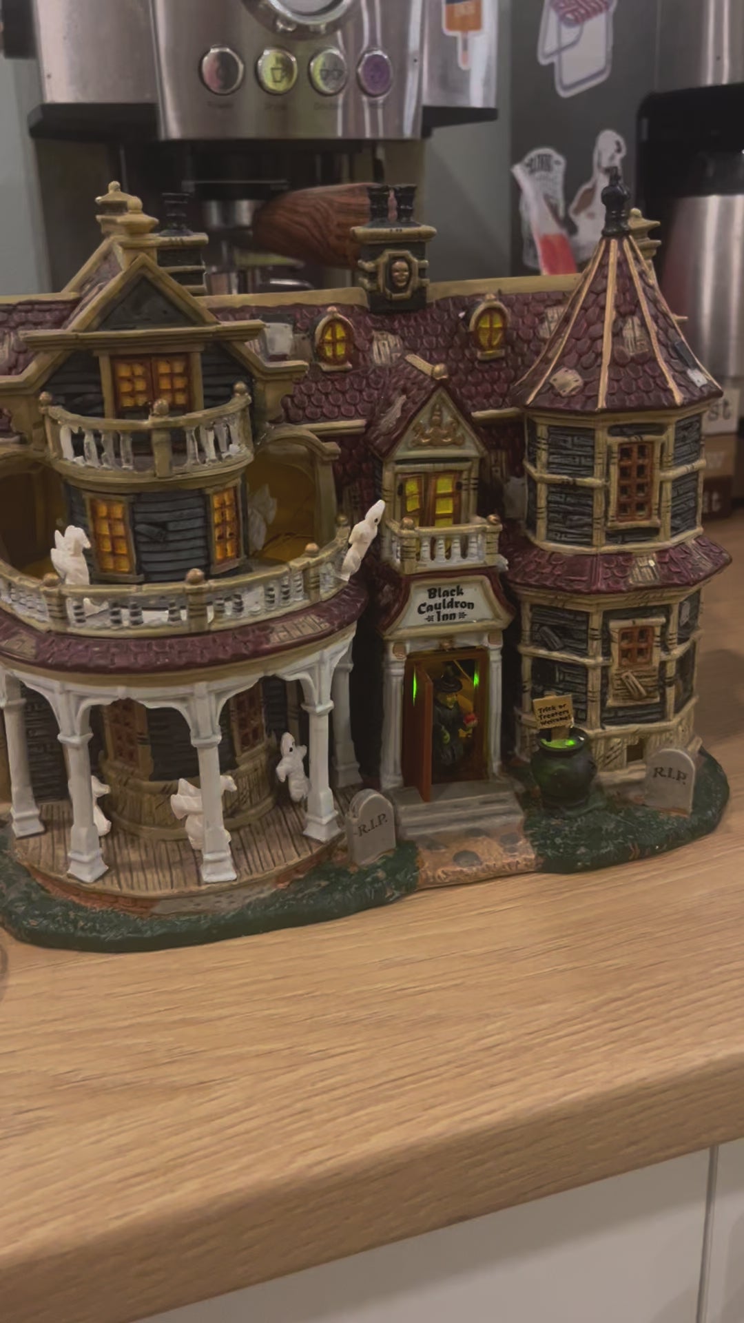 The witch does not emerge from the door, but the ghosts spin around. One of the ghosts fell off the track but was reattached to the balcony.