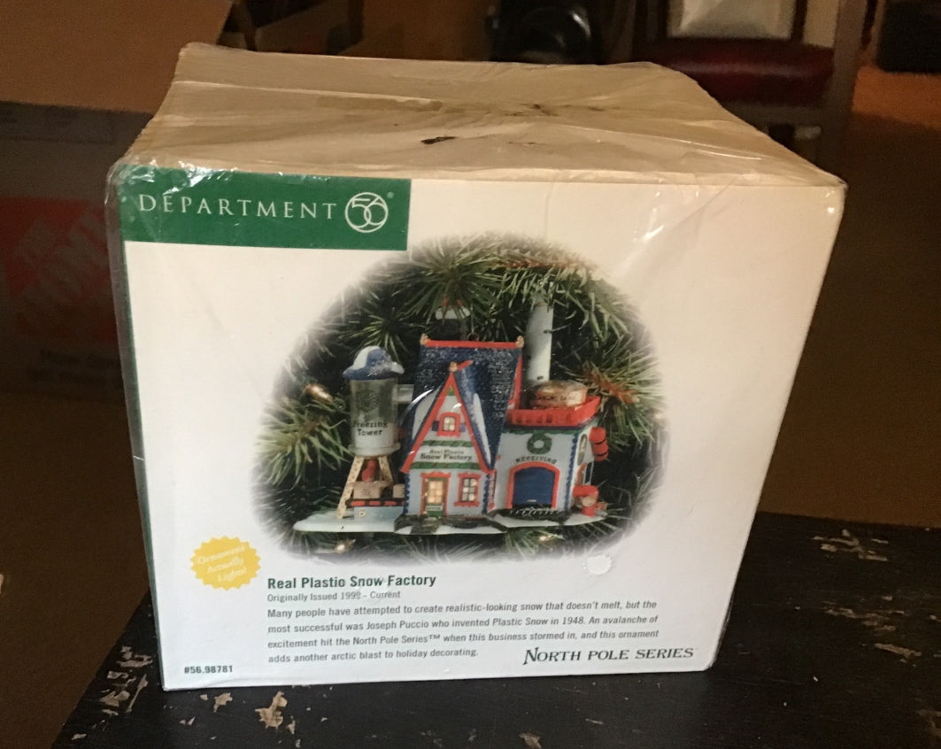 Department 56 North Pole Village Real Plastic Snow Factory (Ornament) – a collectible piece inspired by Santa’s workshop. Whimsical and festive, it’s part of the North Pole Village collection and a perfect addition to any Christmas display.